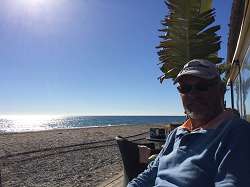 | Es ist immer noch recht windig aber schön warm, also los. Verliere haushoch gegen Uwe (98/107 von wegen Hexenschuß) trotzdem immer wieder schön hier. Haben hier die gleiche Sicht wie in Sotschi - Meer - Palmen - schneebedeckte Berge im Hintergrund - Super oder?? |