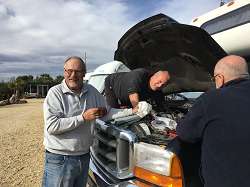 Uwe und unsere Stellplatznachbarn putzen und suchen fast den ganzen Tag nach dem Ursprung des Ölverlustes - ohne wirklichen Erfolg. |